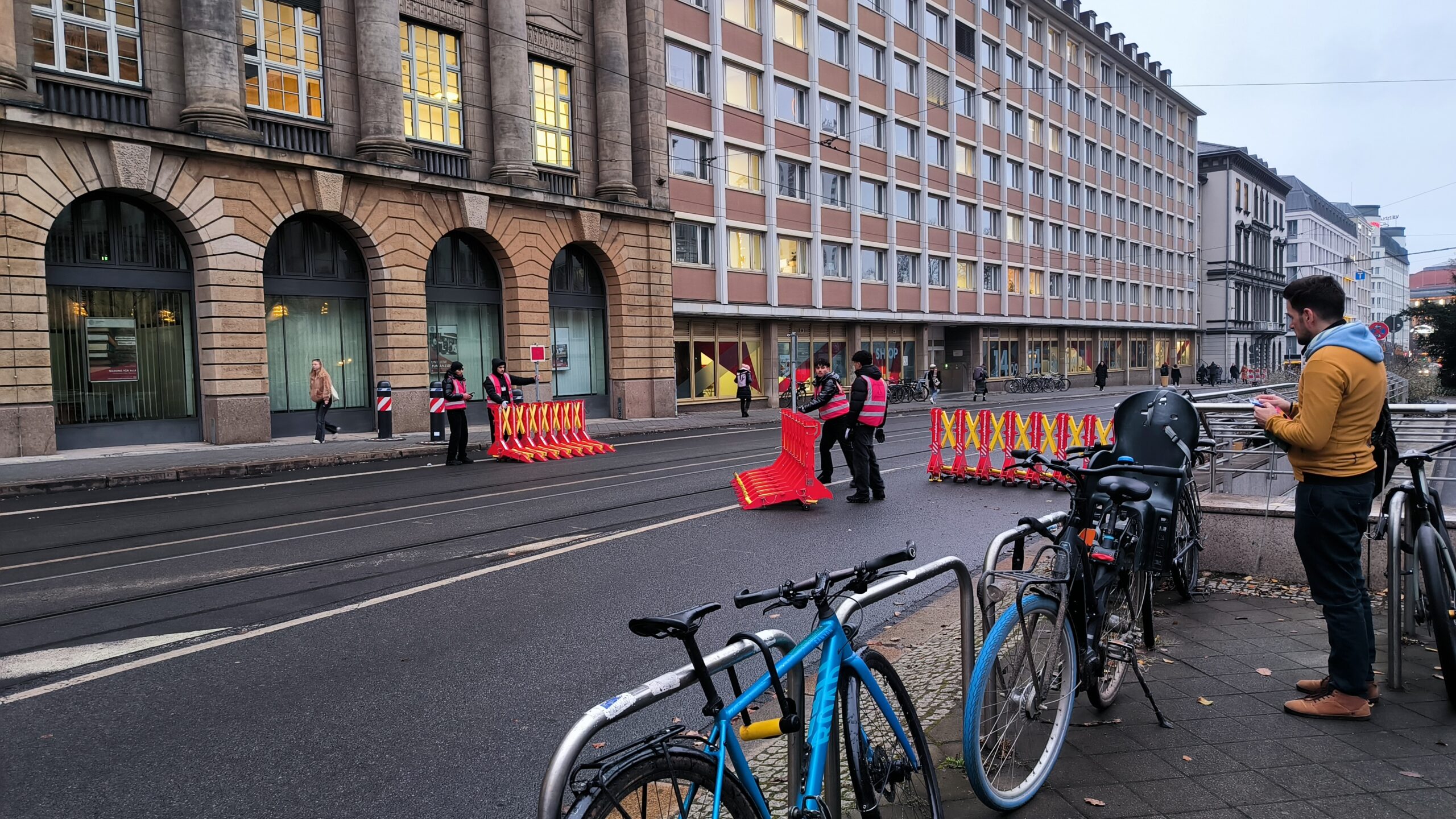Seit Jahren beobachte ich die Sicherheitsmaßnahmen des Leipziger Weihnachtsmarktes im Umfeld des Augustusplatzes. Die Besonderheit: die Straßenbahnen fahren direkt durch die Flächen des Weihnachtsmarktes zwischen Opernhaus und Gewandhaus. Vor einigen Jahren sah das Sicherheitskonzept vor, das zwischen aufgestellten Steinquadern auf der Straße im Bereich der Schienen der Tram ein mit vier bis sechs Polizisten besetzter VW-Bus der regionalen Polizei platziert wurde, der bei Straßenbahnfahrten jeweils vor und zurück fuhr.